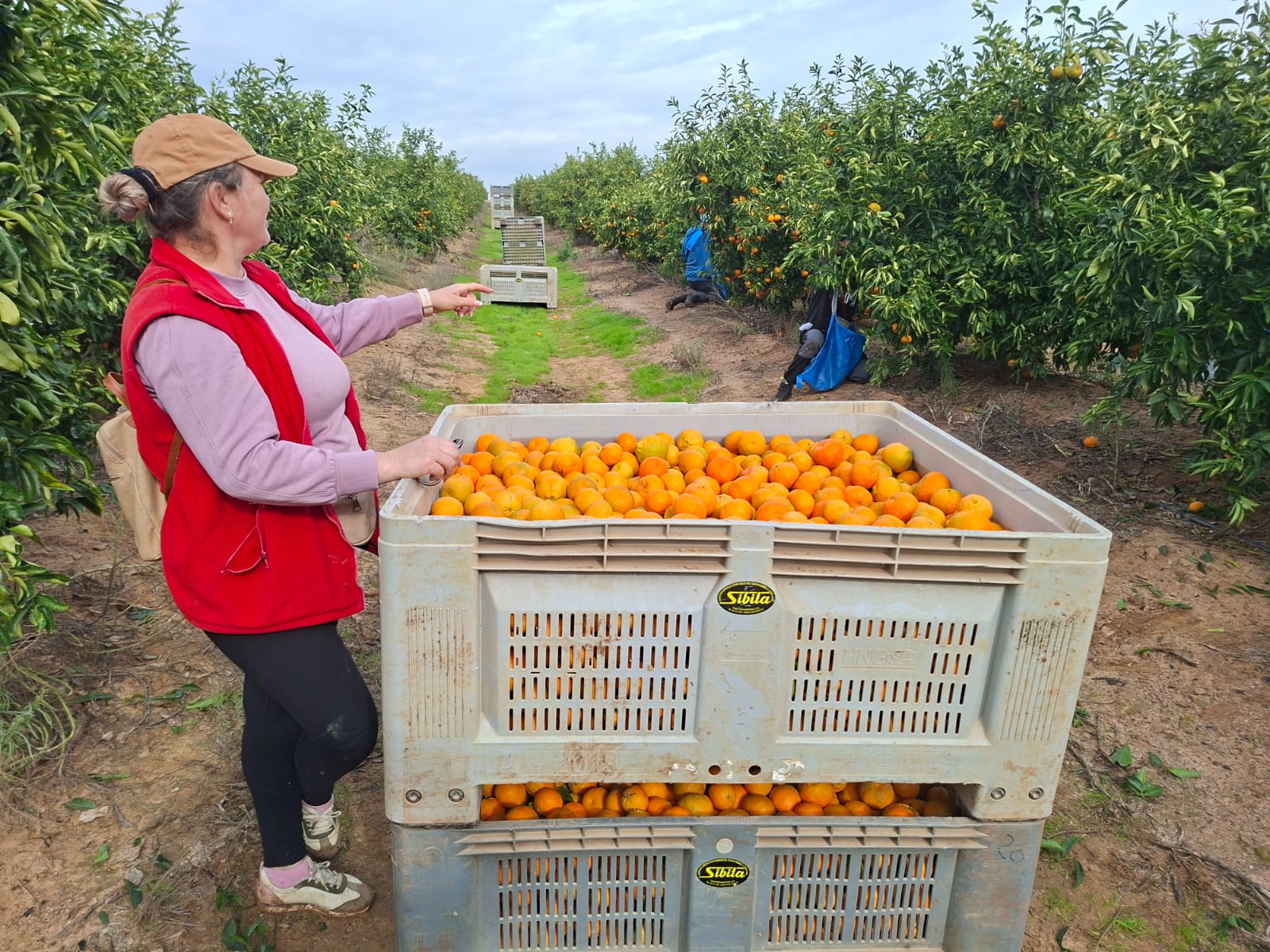 Dieses Bild zeigt zwei Arbeiter, die frische Orangen direkt auf den Feldern von Don Vital in Andalusien ernten. Es unterstreicht das Engagement des Unternehmens für hochwertige Landwirtschaft und frische Produkte.